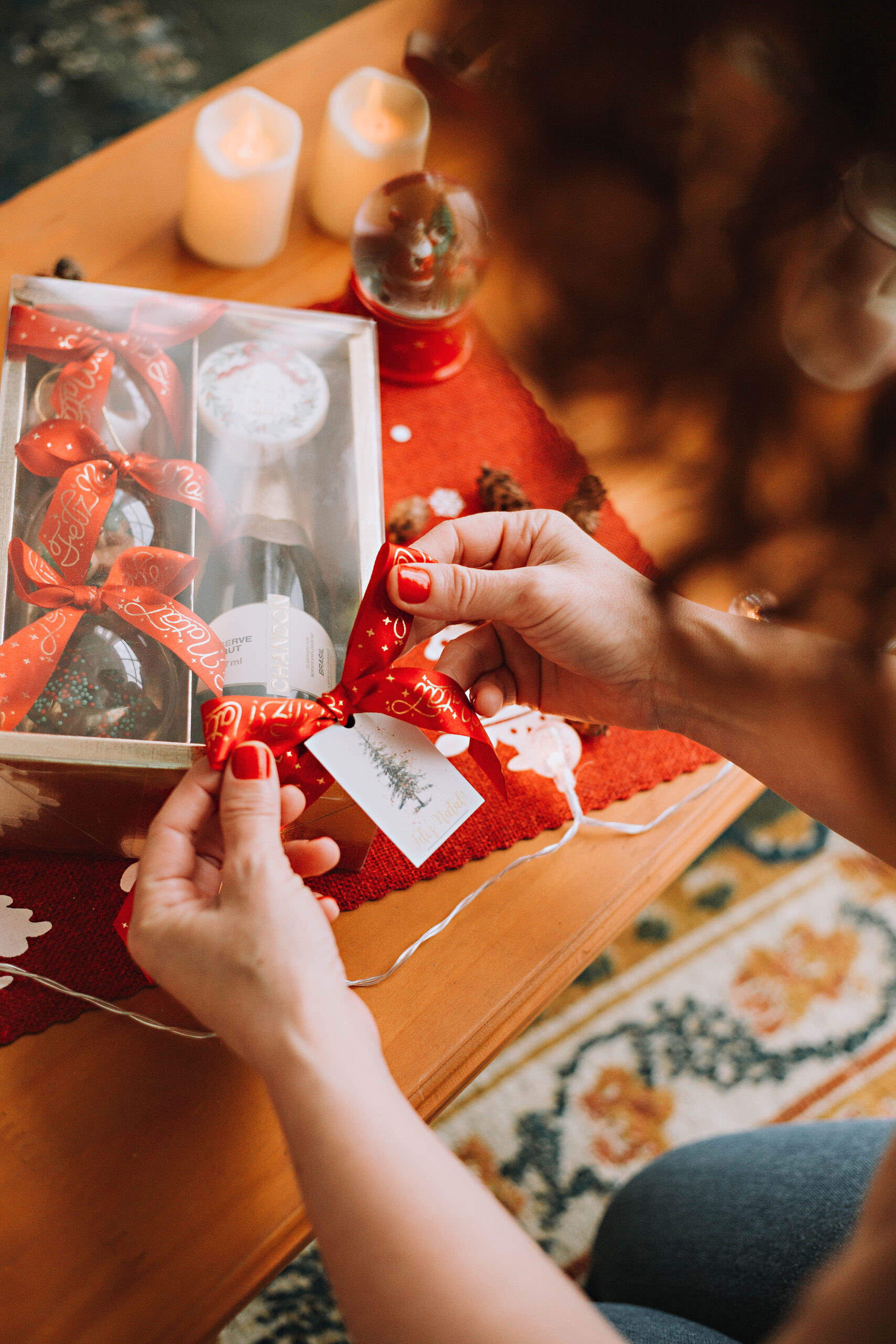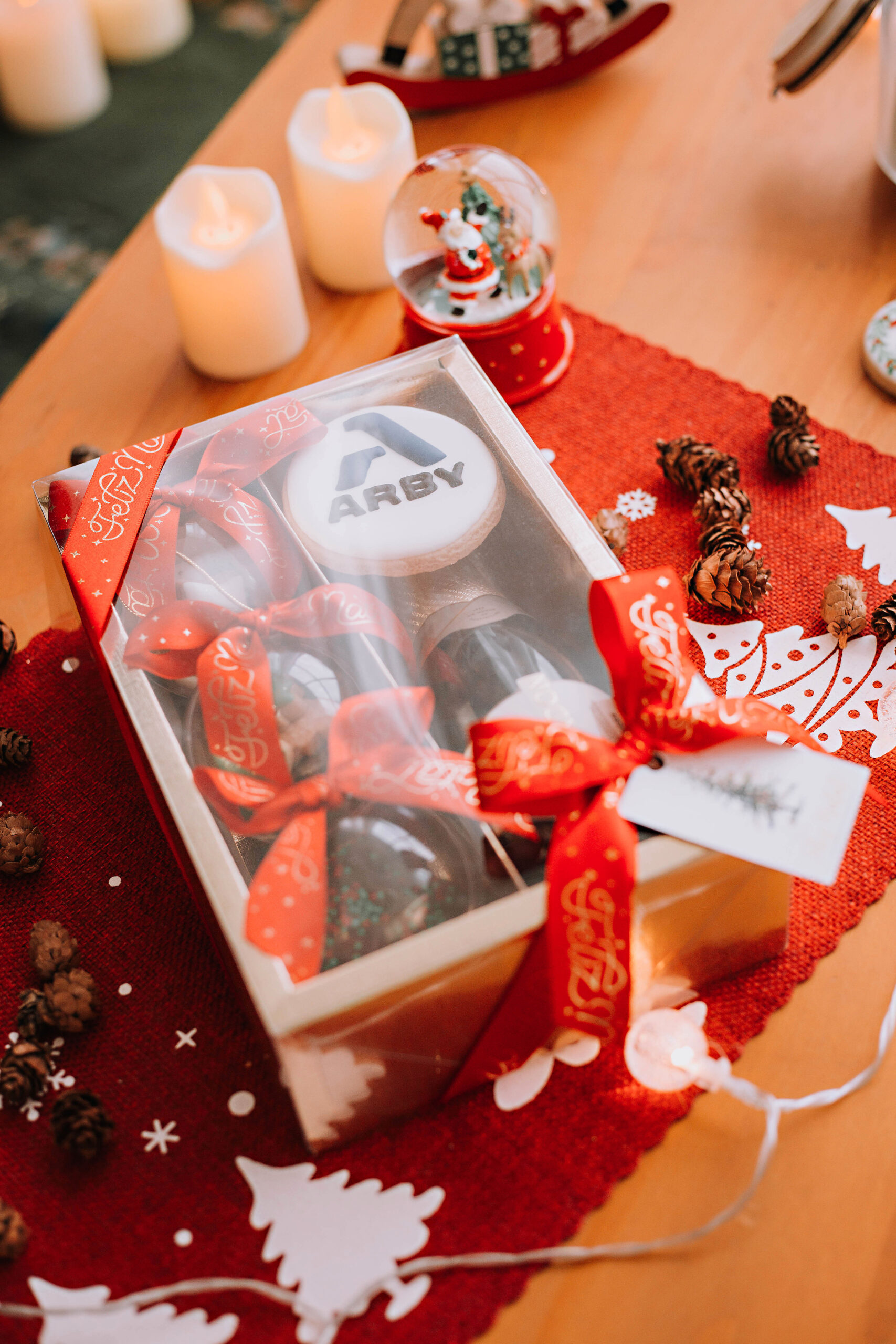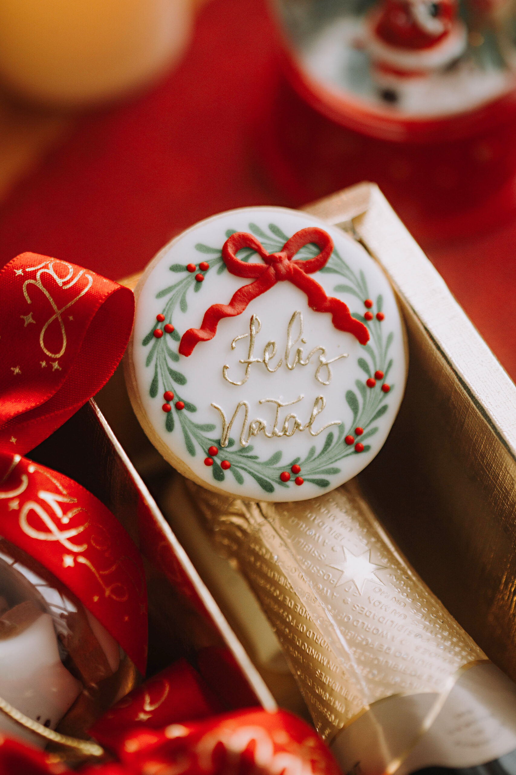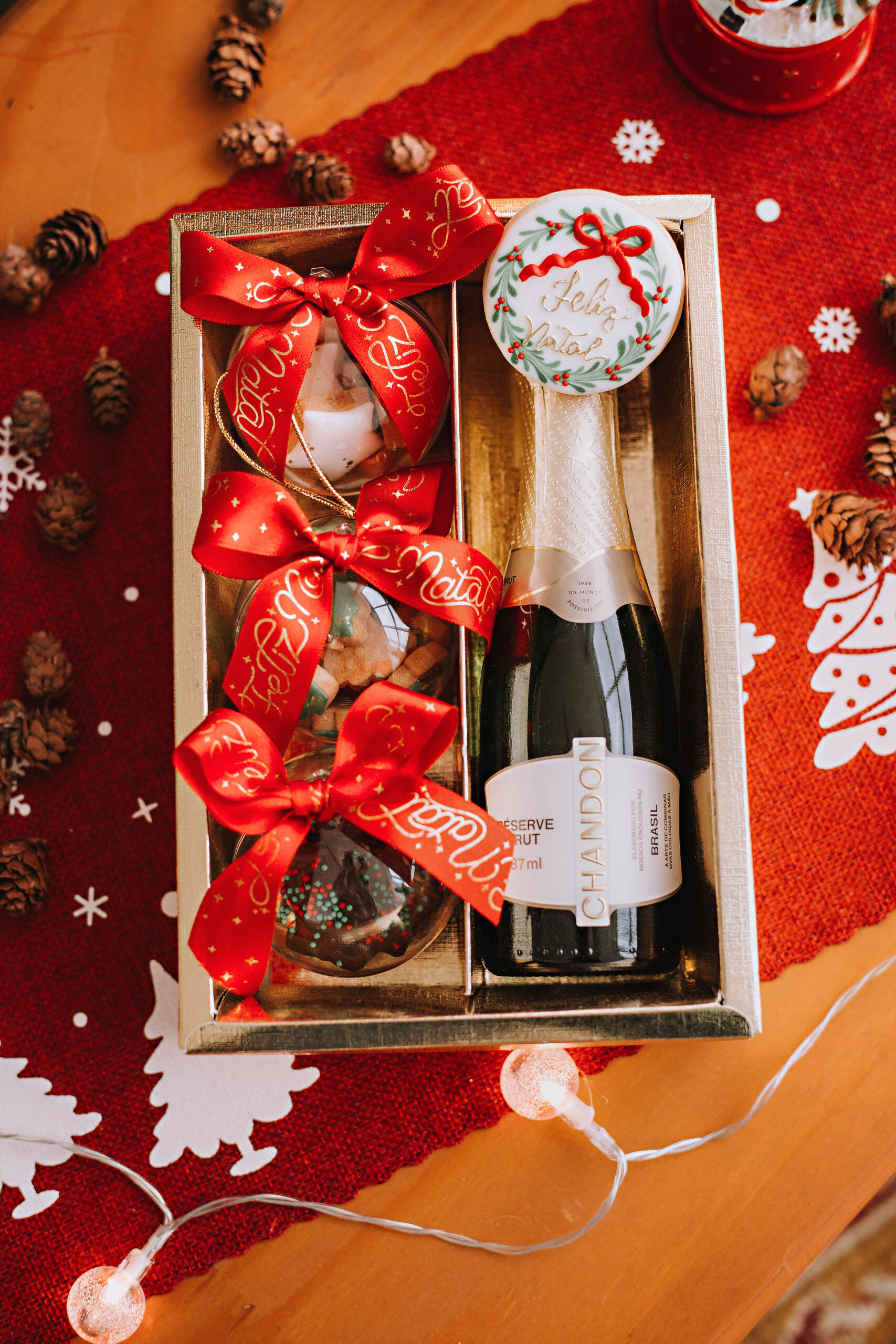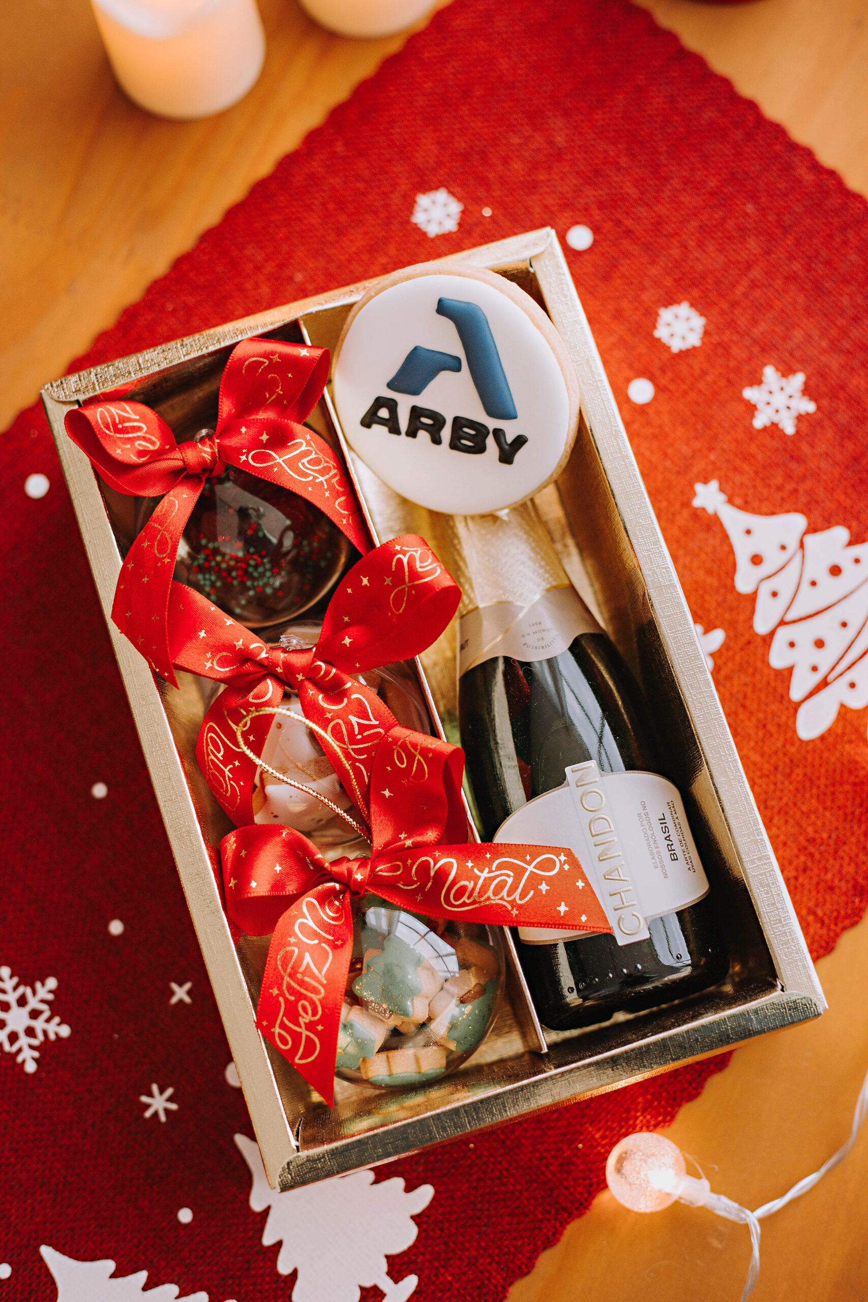 Caixa presente com espumante Chandon mini, Biscoito Amanteigado de Baunilha LOGOMARCA e três bolas Natalinas recheadas de Petits Fours Natalinas (árvores glaceadas, estrelas glaceadas e estrelas banhadas em Chocolate).
