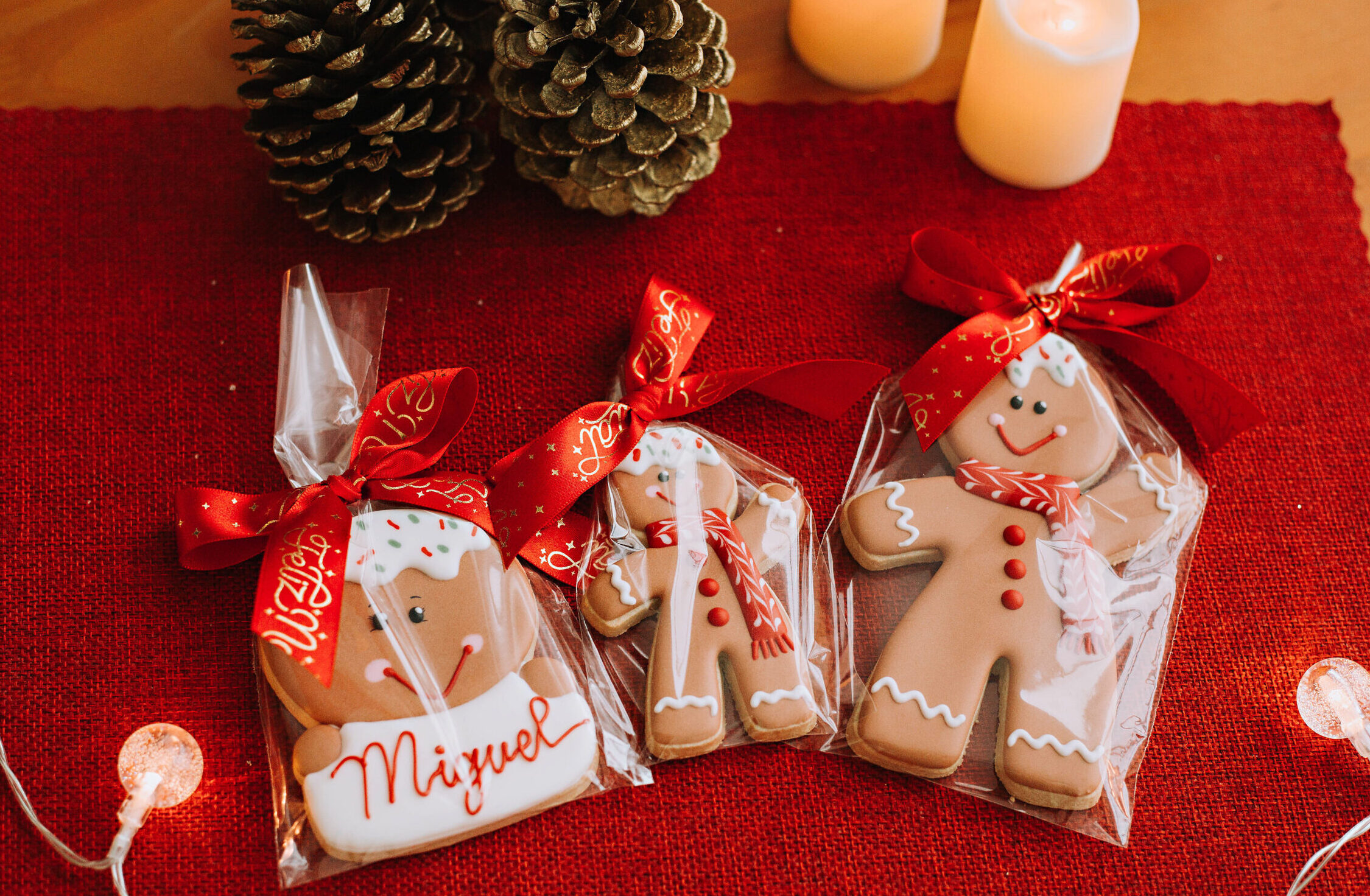Bolas de acrílico com Biscoitos amanteigados de Baunilha com personagens natalinos: Papai Noel, Mamãe Noel, Boneco de Neve, Ginger Rostinho, Ginger completo, Grinch, Rena, Urso Polar.
